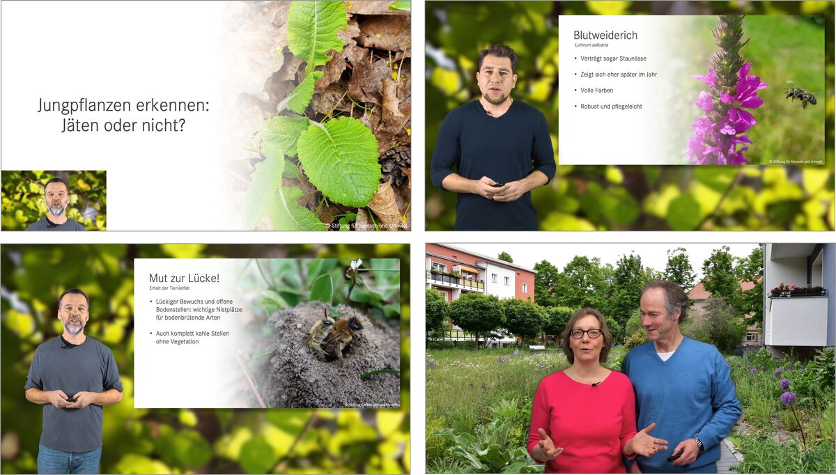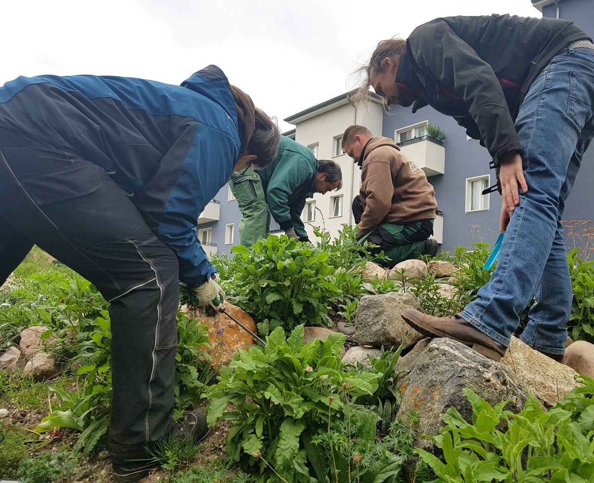 Damit die umgestalteten Flächen langfristig erhalten bleiben, ist eine fachgerechte Pflege notwendig. Daher führen wir Pflegeworkshops mit GaLaBau-Firmen durch. All unsere Erfahrungen aus Naturgartenbau, Pflege und Kommunikation haben wir in Lehrmaterialien überführt. Hier bieten vor allem unser Handlungsleitfaden und unsere Online-Lernplattform für naturnahes Grün viele Informationen für alle Interessierten.